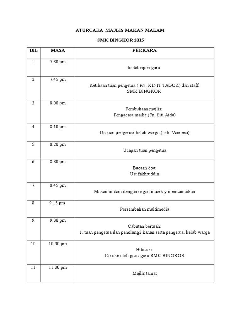 Aturcara majlis perkahwinan waktu malam. KERTAS KERJA MAJLIS MAKAN MALAM 2014. Interested in flipbooks about Tentatif Makan Malam.